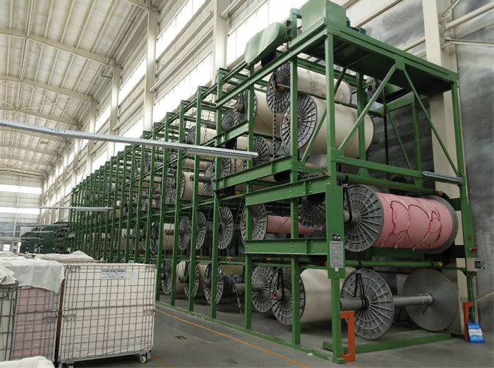 經軸染色機(BEAM)將織物卷于多孔滾筒的卷軸之上,裝填于壓力